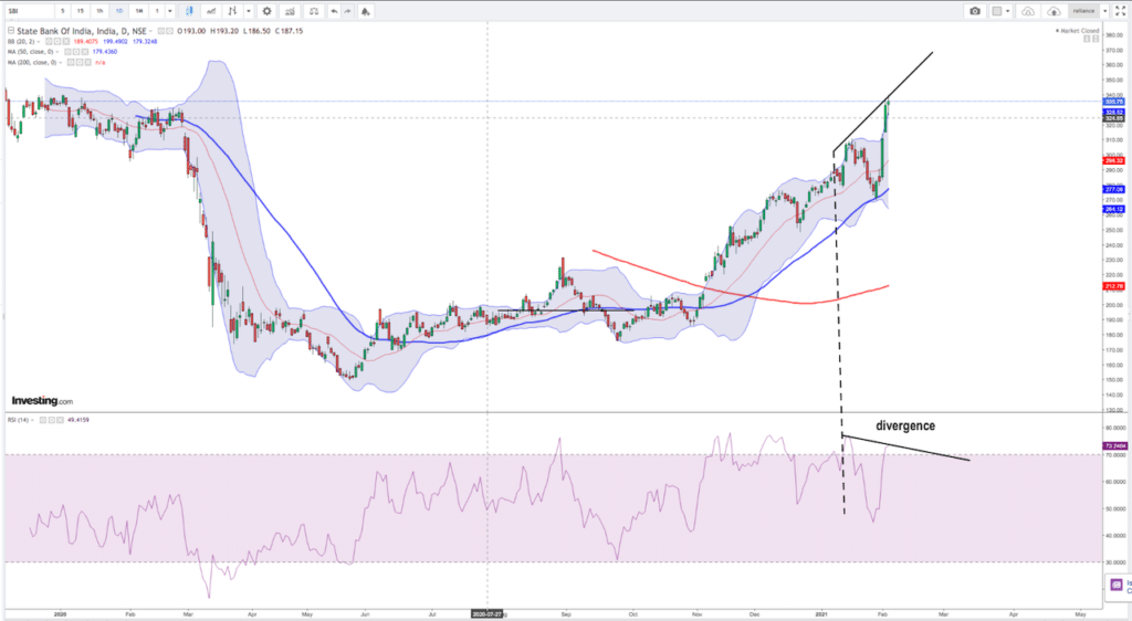 This takes place when there is a rise or fall in price which is not followed up by the rise or fall in RSI in the same proportion. example of same is given below in the chart of SBI