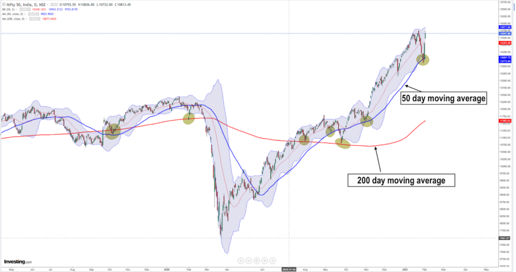 I have marked the supports or touch points where the nifty rose from the 50 day or the 200 day moving average.